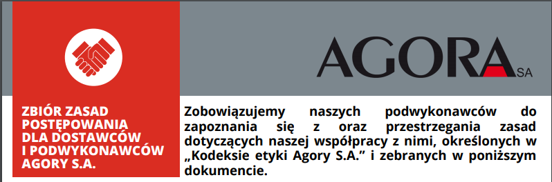 Dla usprawnienia relacji z dostawcami powstał „Zbiór zasad postępowania dla dostawców i podwykonawców Agory”, opublikowany na stronie agora.pl, który zawiera najważniejsze zasady współpracy dla dostawców i podwykonawców. Jednocześnie podwykonawcy Agory zostali zobowiązani do zapoznania się z zasadami określonymi w tym dokumencie i przestrzegania ich. (Więcej w części dot. Etyki). Ze względu na rozproszoną i różnorodną działalność biznesów i poszczególnych spółek Grupy Agora nie powstał formalny dokument odnoszący się do współpracy z partnerami biznesowymi, kontrahentami oraz dostawcami. Wdrożone zostały procedury przetargowe, zasady postępowania przy zawieraniu umów między Agorą a innymi podmiotami oraz inne regulacje określające zasady współpracy, np. „Procedura wyboru dostawców towarów i usług w pionie administracji Grupy Agora”.