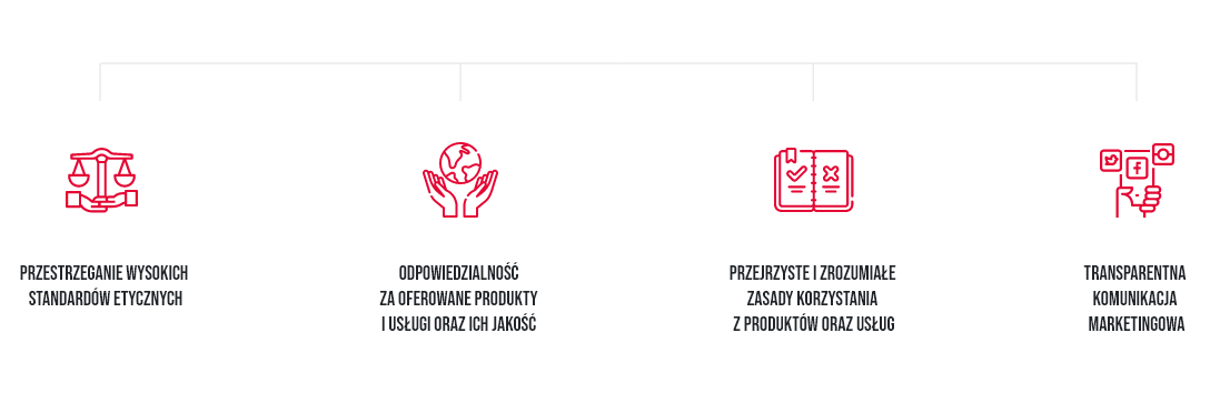 uczciwość i postępowanie zgodne z najwyższymi standardami etyki oraz transparentność w relacjach z klientami i partnerami biznesowymi