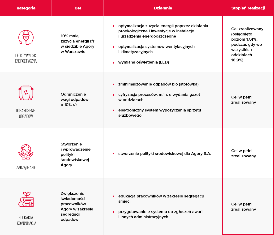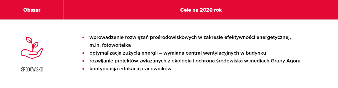 Ze względu na współdzielenie przestrzeni zarówno w warszawskiej, jak również w wielu innych siedzibach, przestrzeni przez Agorę S.A. i spółki z Grupy Agora, dane zostały zagregowane i dotyczą lokalizacji: Białystok, Bielsko-Biała, Bydgoszcz, Częstochowa, Gdańsk, Gorzów Wlkp., Katowice, Kielce, Kraków, Lublin, Łódź, Olsztyn, Opole, Płock, Poznań, Radom, Rzeszów, Szczecin, Toruń, Wrocław oraz Warszawa (siedziba przy ul. Czerskiej 8/10). Brak danych z Tych i Zielonej Góry (opłaty za energię wliczone są w czynsz).