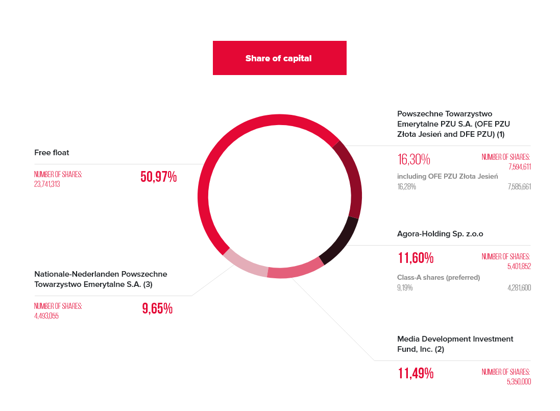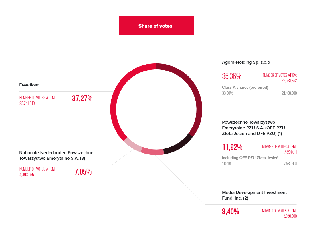 Communications of AGORA S.A. with all stakeholders, including investors, analysts, shareholders and other members of the capital markets is of crucial importance and is always conducted with transparency and integrity. Agora regularly organizers meetings for investors, shareholders and the media, with presentations of the group’s financial results. At least four such meetings for investors and journalists are held each year. To provide equal access to information, Agora streams the reporting sessions with simultaneous translation to English, On-site as well as online participants can join Q&A session with the members of Management Board of Agora.